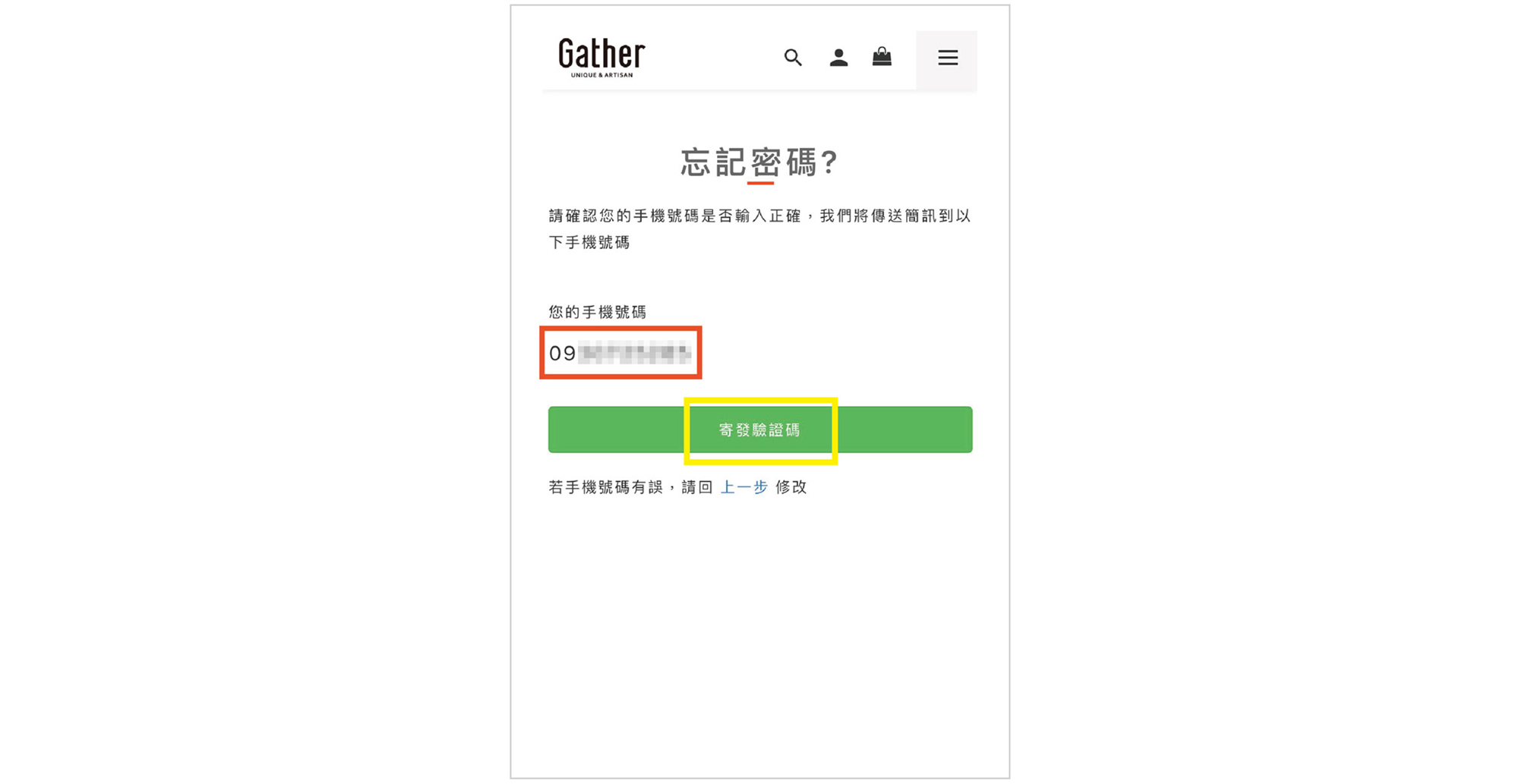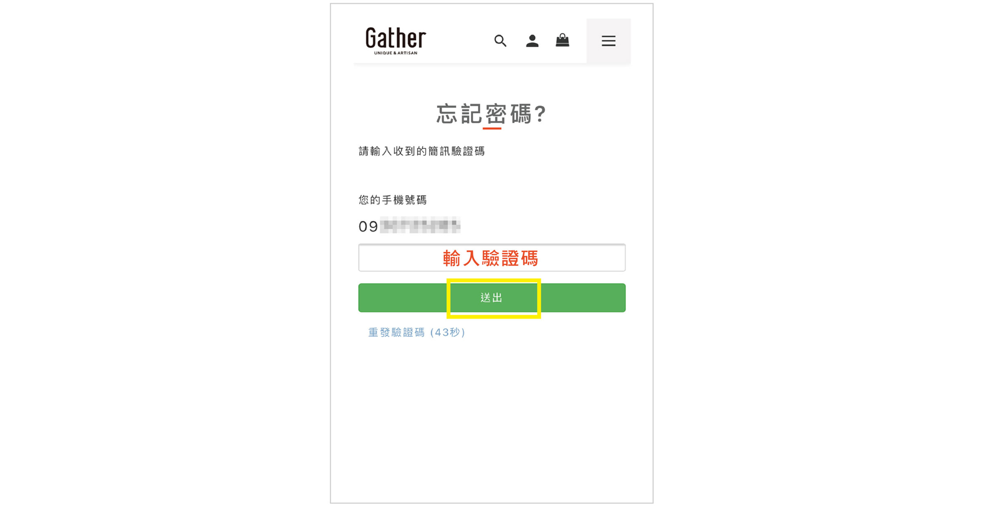 Step5:系統將發送驗證碼簡訊至您的手機,請您輸入收到的驗證碼。