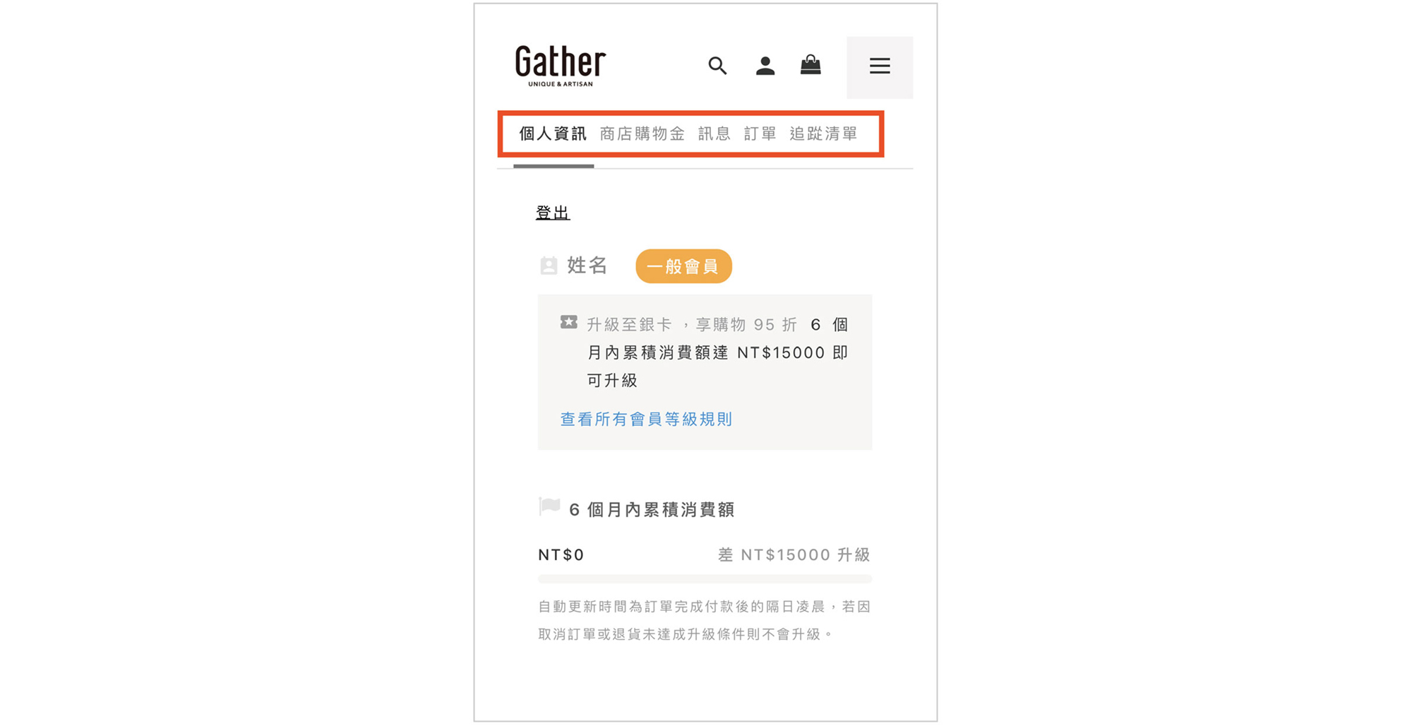 Step8:會員頁面內可查詢「會員資訊、購物金、客服留言、訂單、商品追蹤」。
