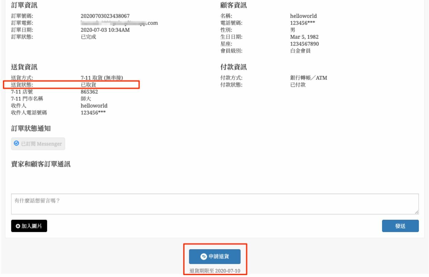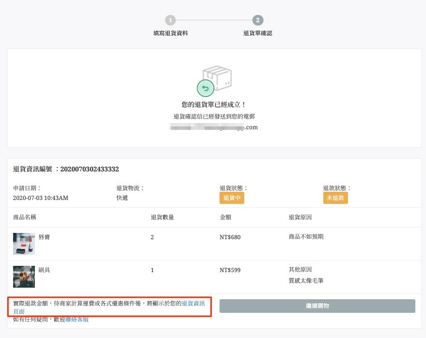 • 在申請退貨資訊頁面上顯示的商品金額,並非實際退款金額,最終實際退款金額顯示在退款紀錄中。