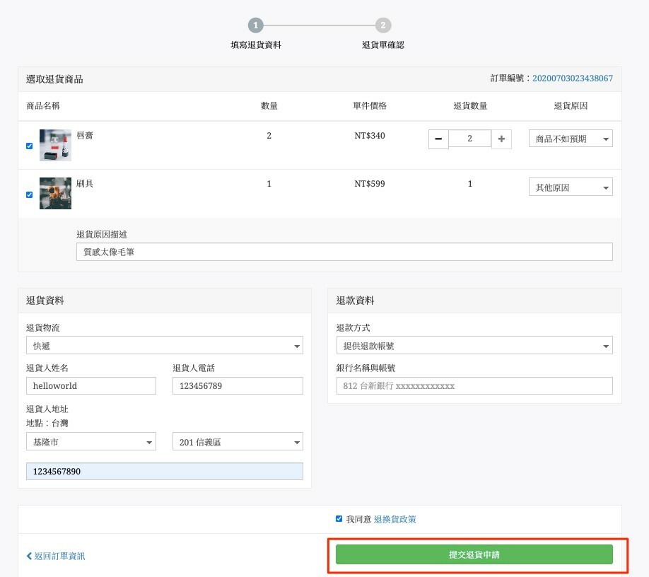 2.勾選訂單內您欲退貨的商品並填寫退貨數量、退貨原因、退貨方式及退款資料,點選「提交退貨申請」