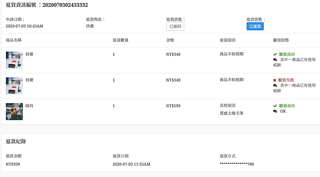 可在此頁面查詢退貨狀態、退款狀態、驗貨狀態及退款紀錄等資訊